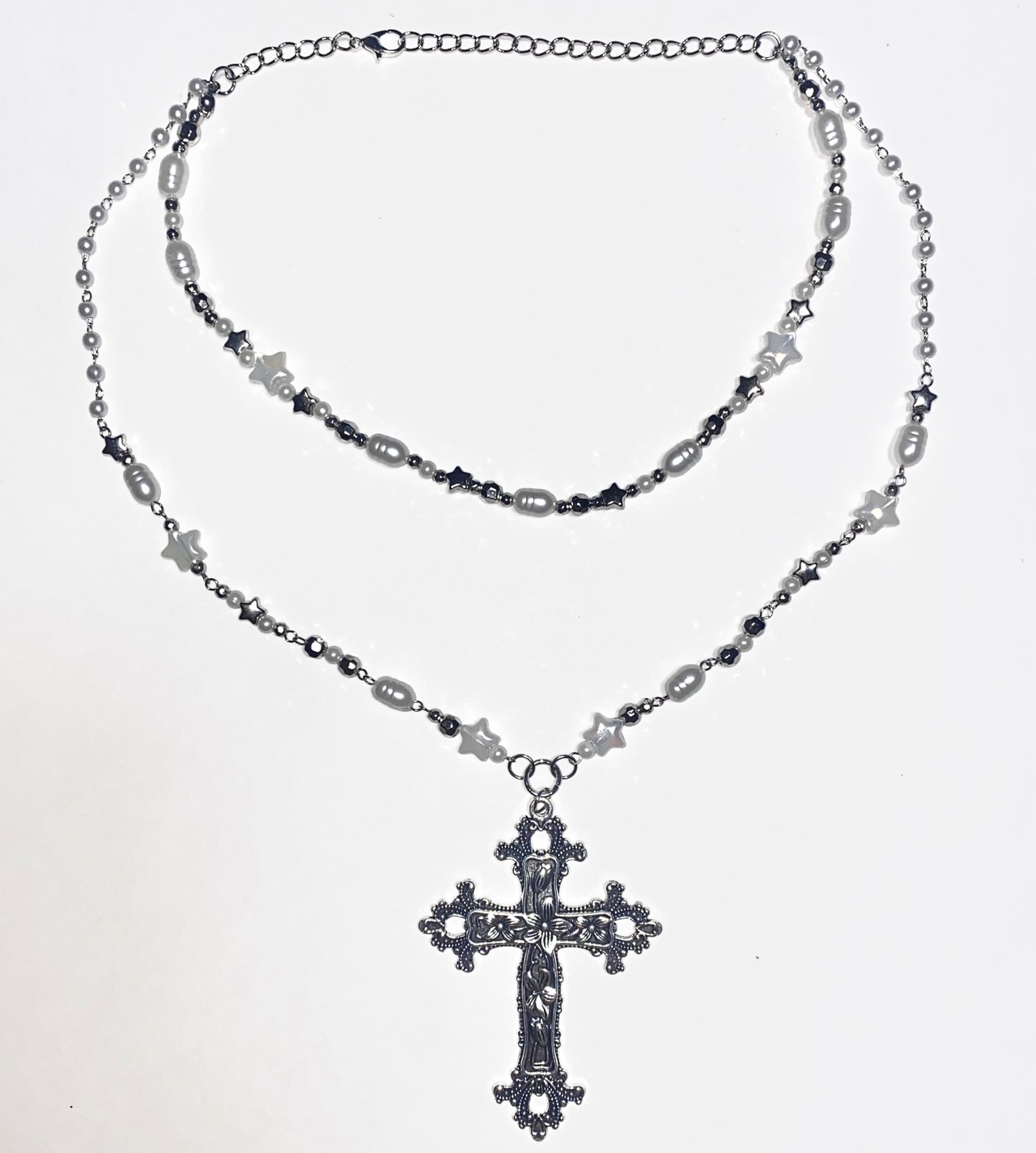 大きな十字架と白とシルバーで組み合わされた透明感のあるネックレスです。
