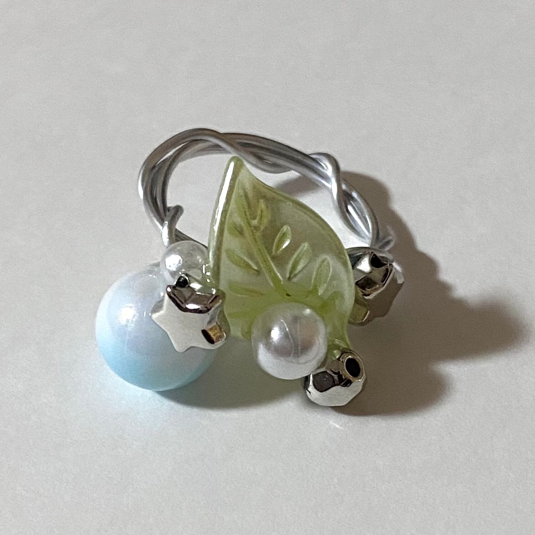 葉っぱと星、薄い水色のビーズが可愛い指輪です。