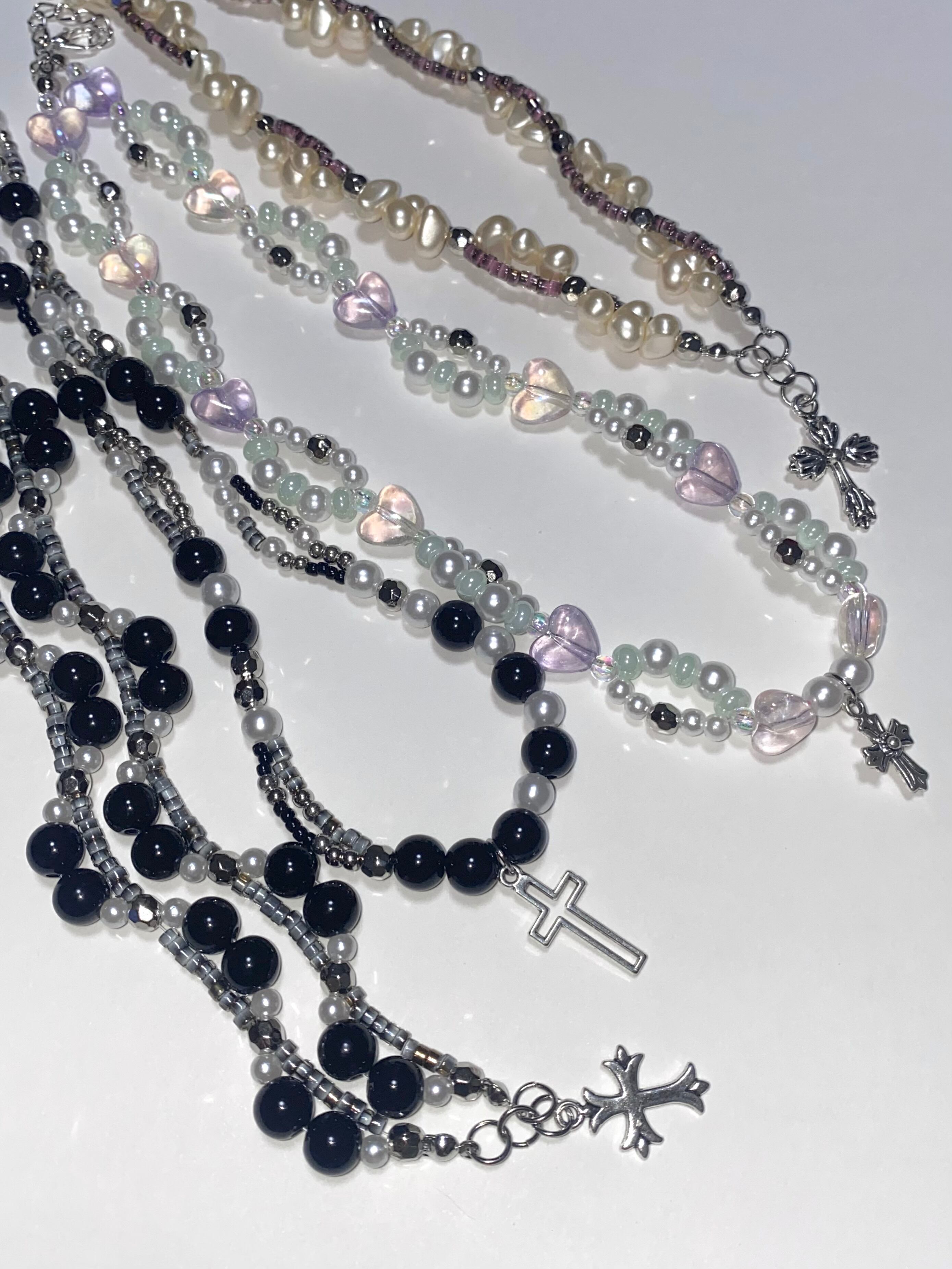 ベージュとピンクのビーズの色合いが大人っぽく十字架も素敵なネックレスです。