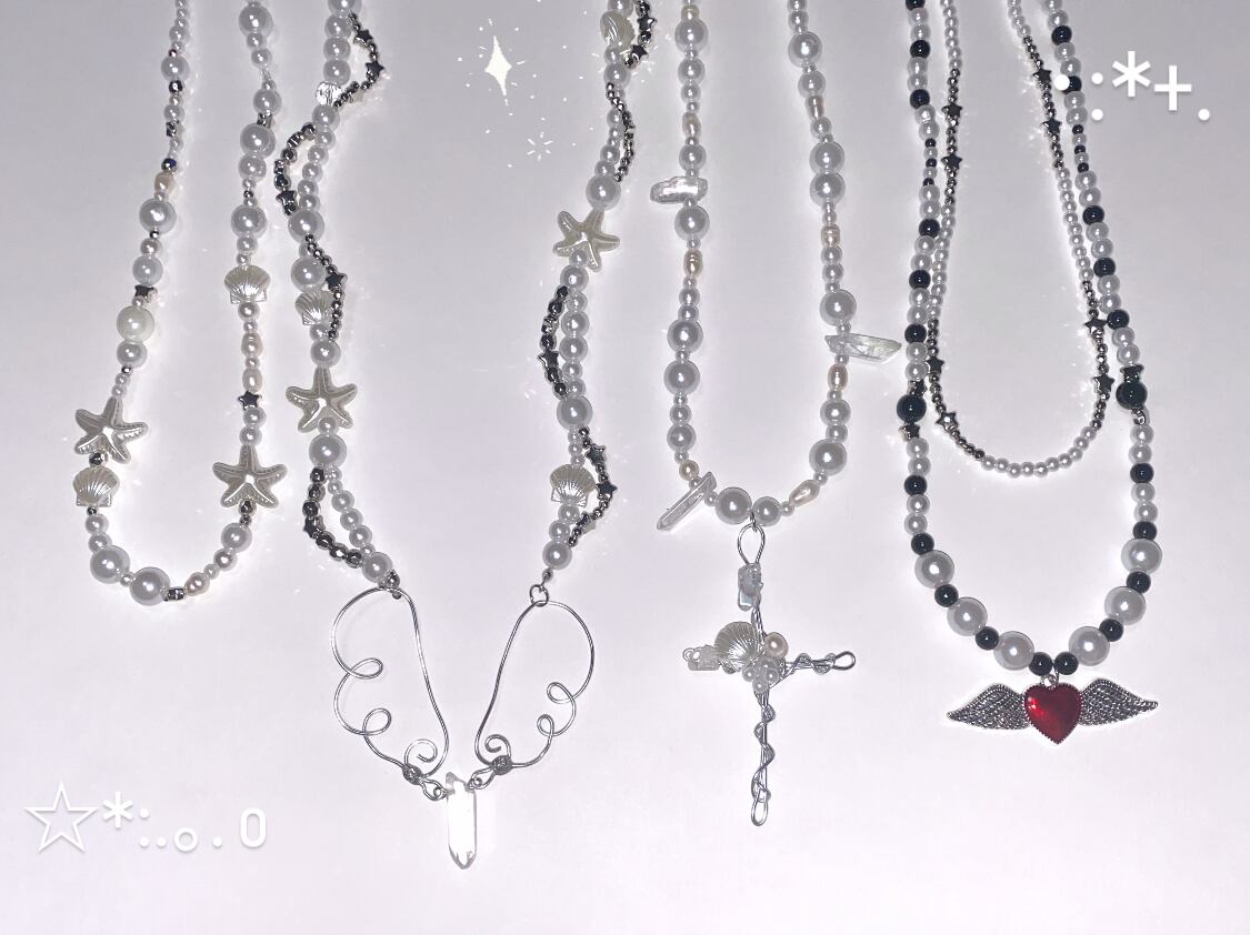 パールと白いビーズを組み合わせた貝殻のパーツが可愛いネックレスです。
