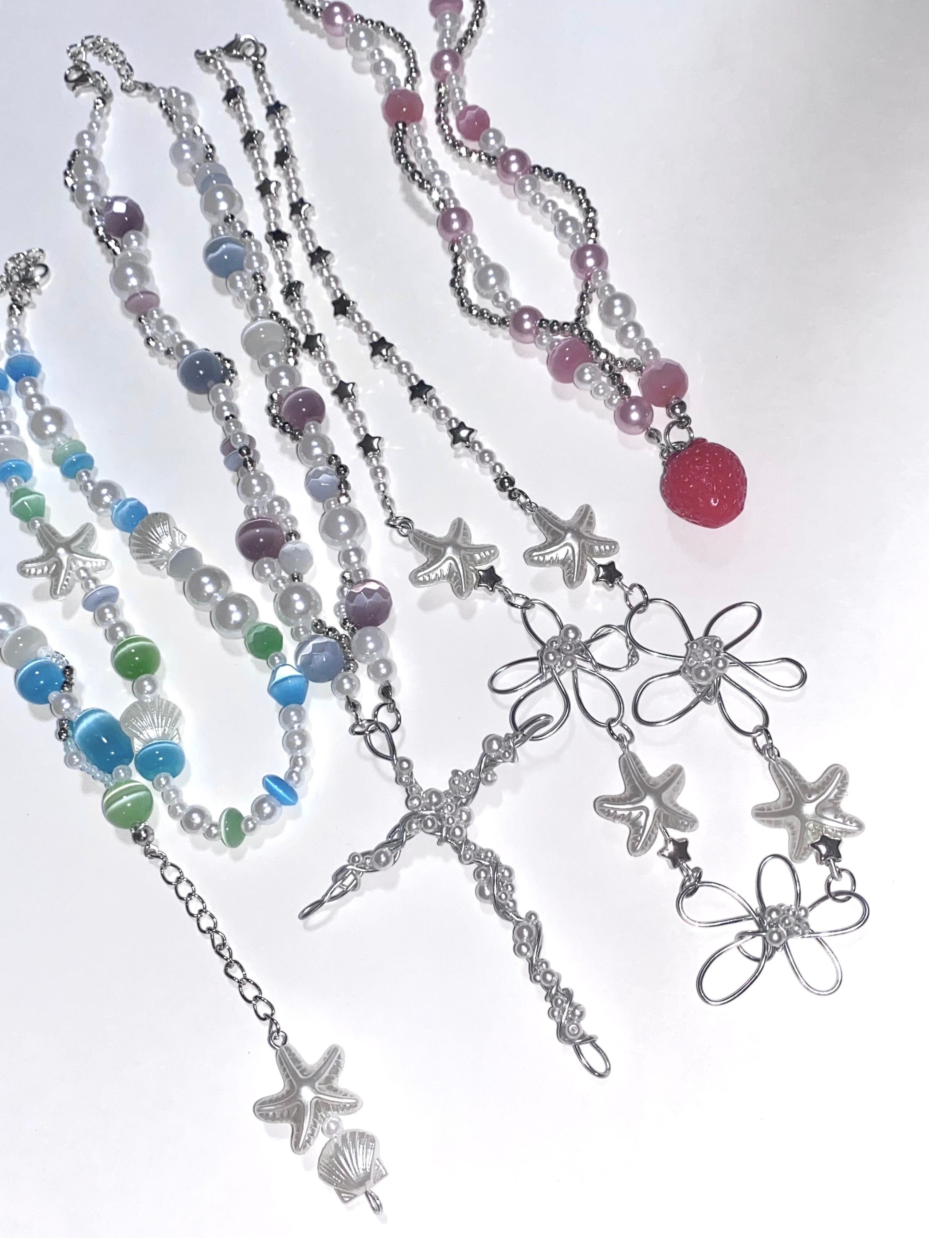 手作りのお花のパーツが魅力的な、貝殻とお花の可愛らしいネックレスです。