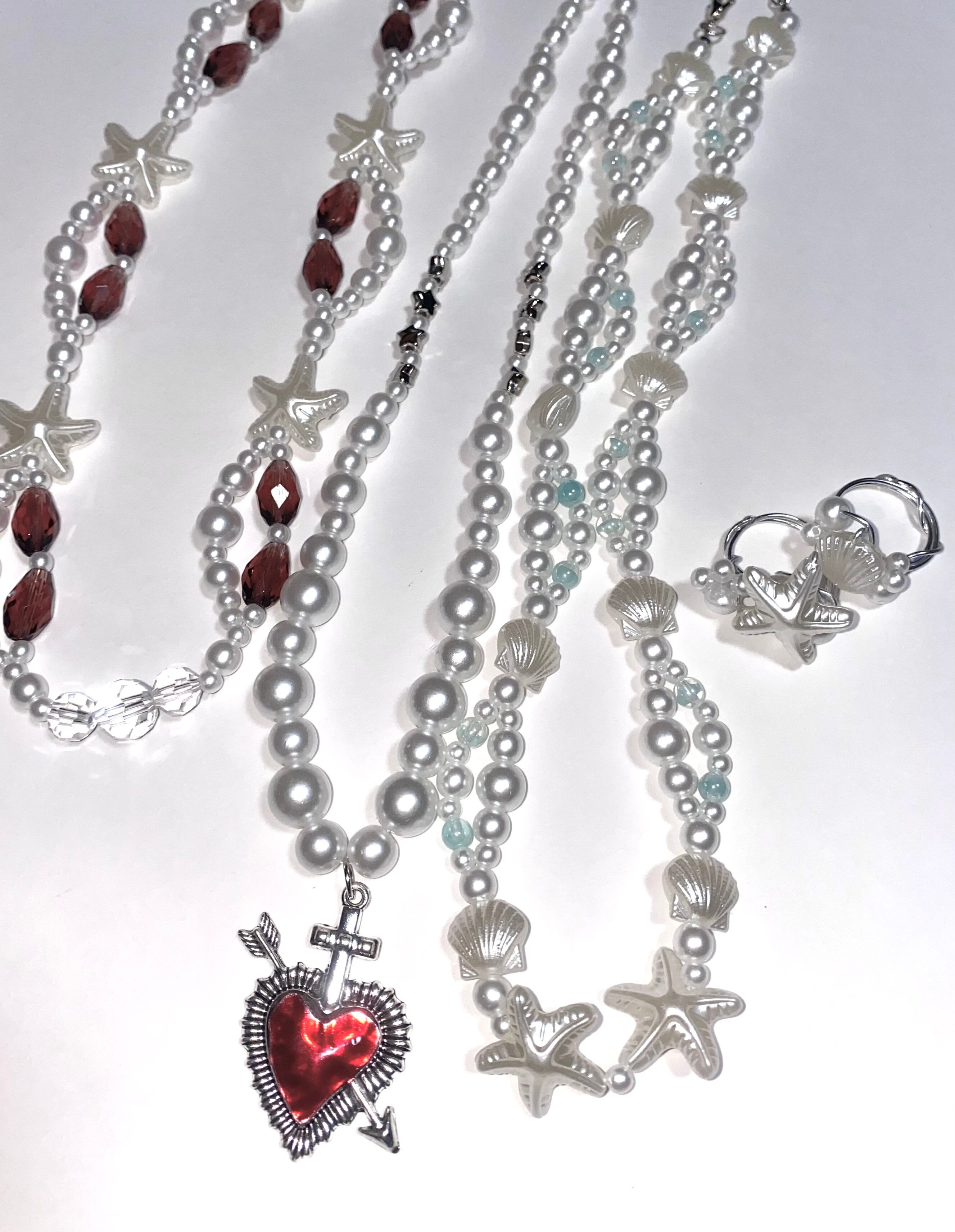 白いビーズに赤いハートのパーツが映える可愛らしいネックレスです!