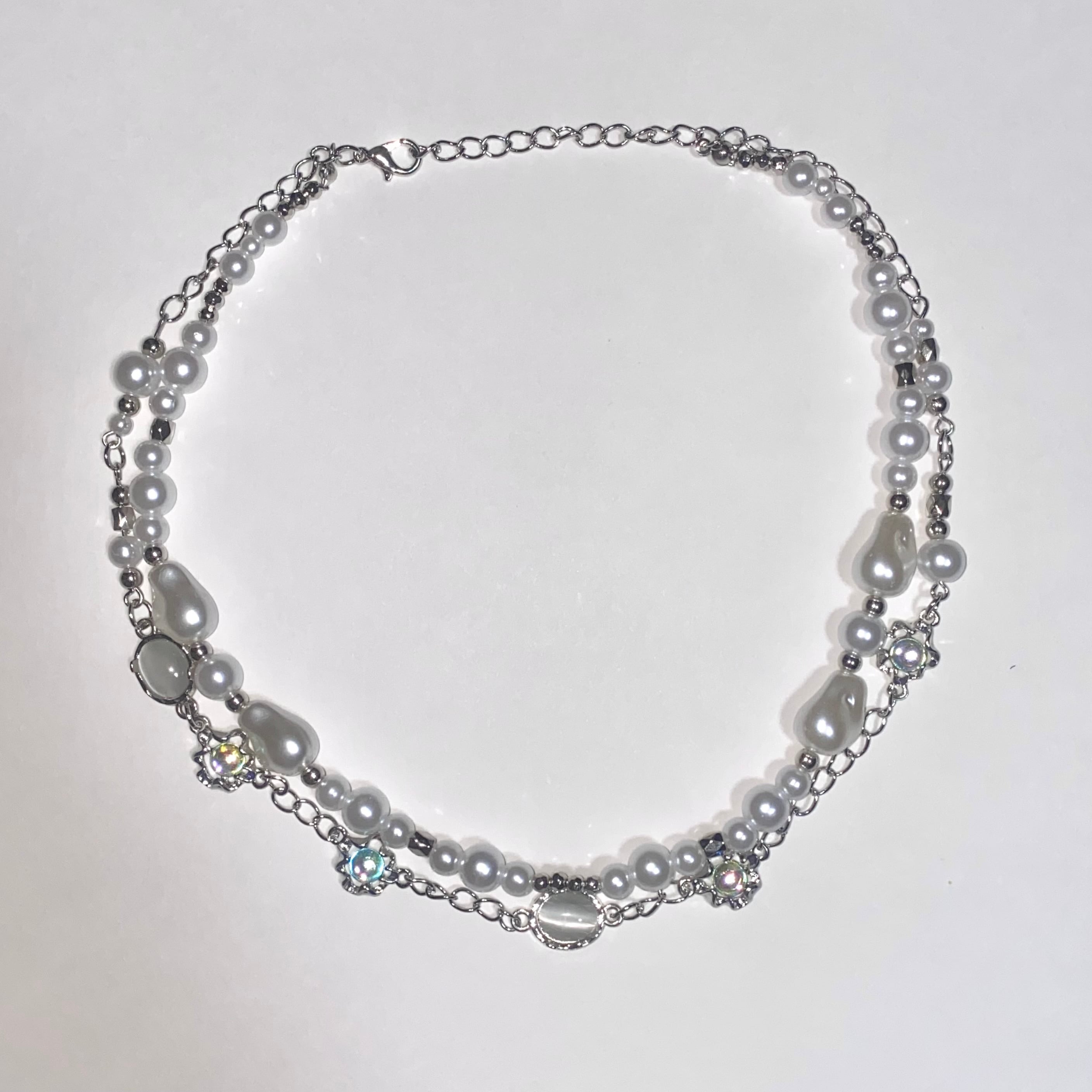 ホワイトとシルバーのビーズで組み合わされたかっこいい二重のネックレスです。