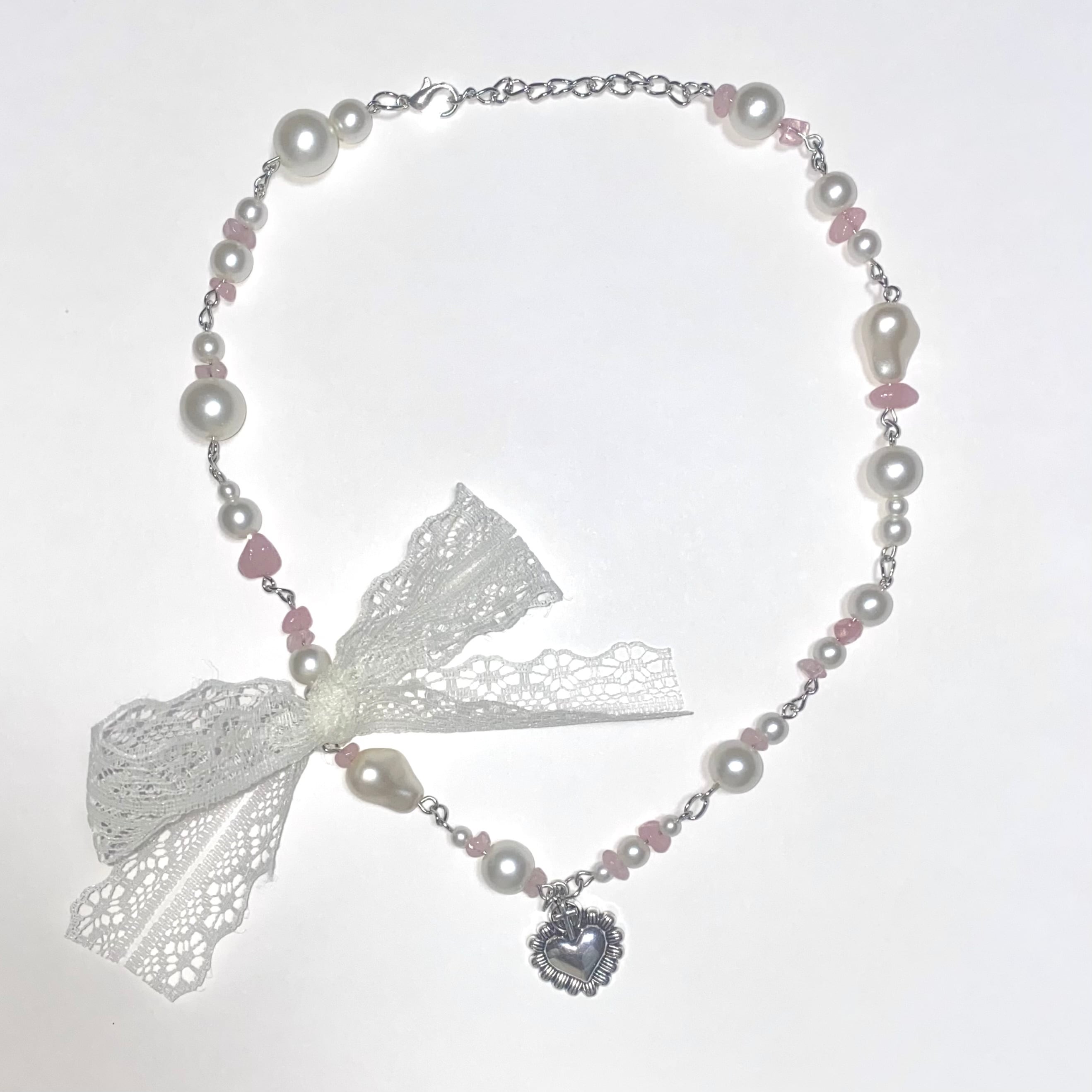 ピンクとベージュの色合いとレースのリボンが可愛らしいネックレスです。
