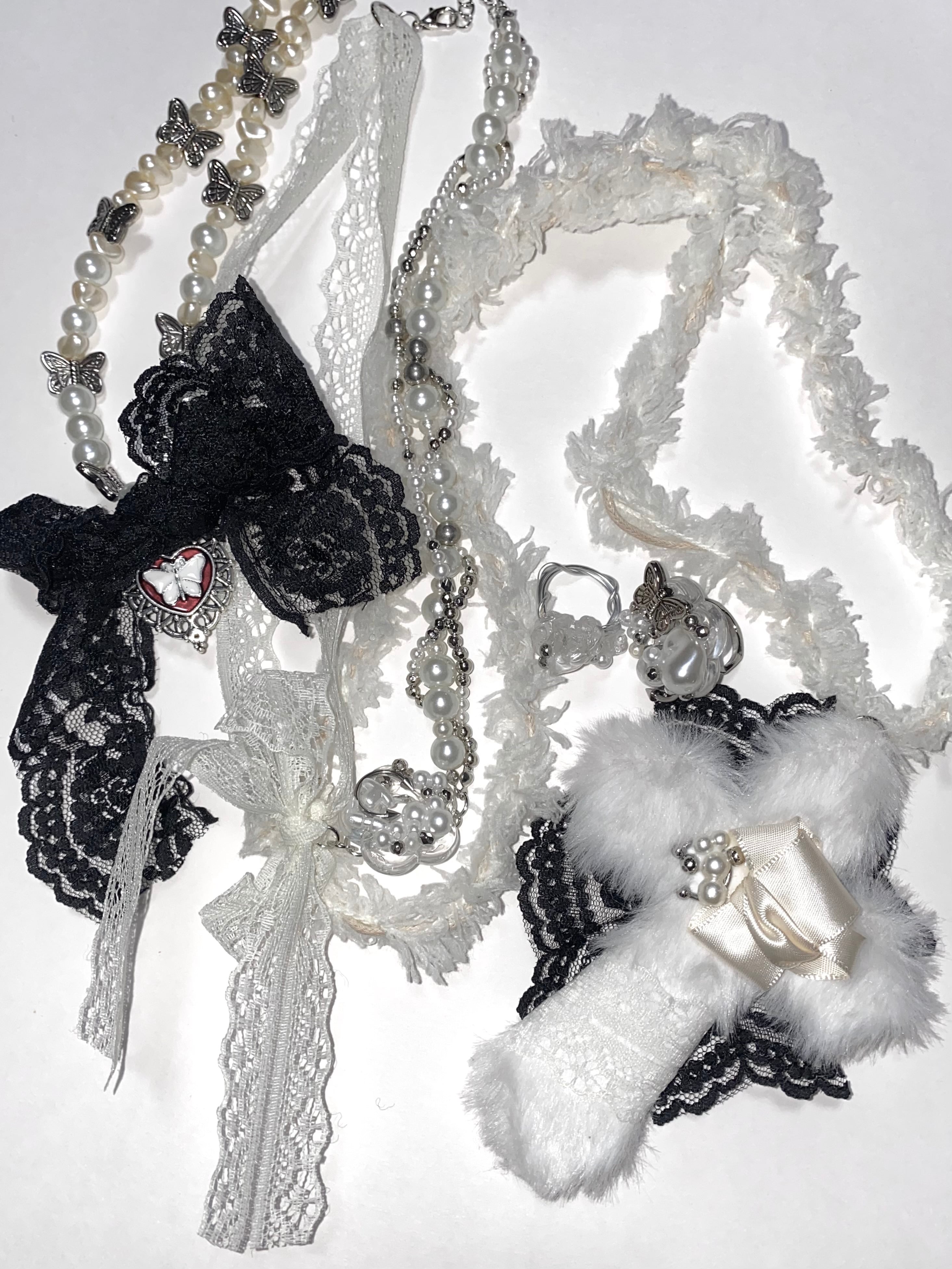 ドロップをイメージしたパーツとレースのリボンが可愛らしいネックレスです。