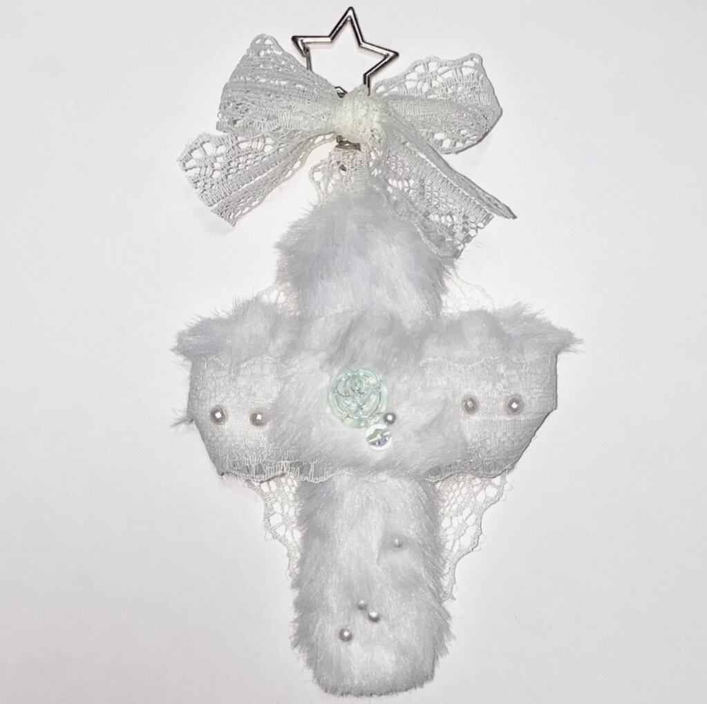 レースとふわふわの十字架が可愛らしいキーホルダーです。