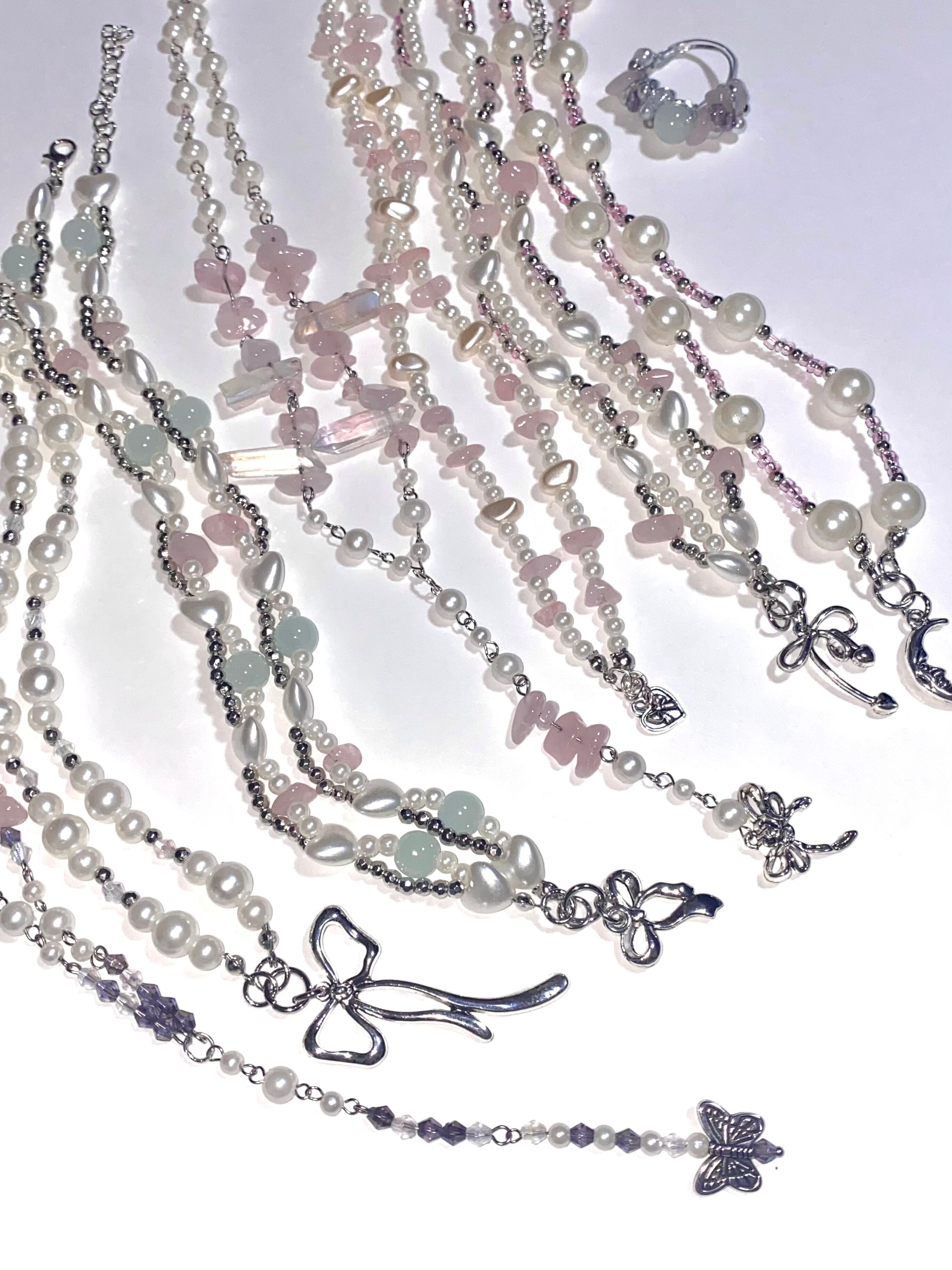 ロザリオ風のネックレス、ピンクと紫の色合いが可愛らしいです。