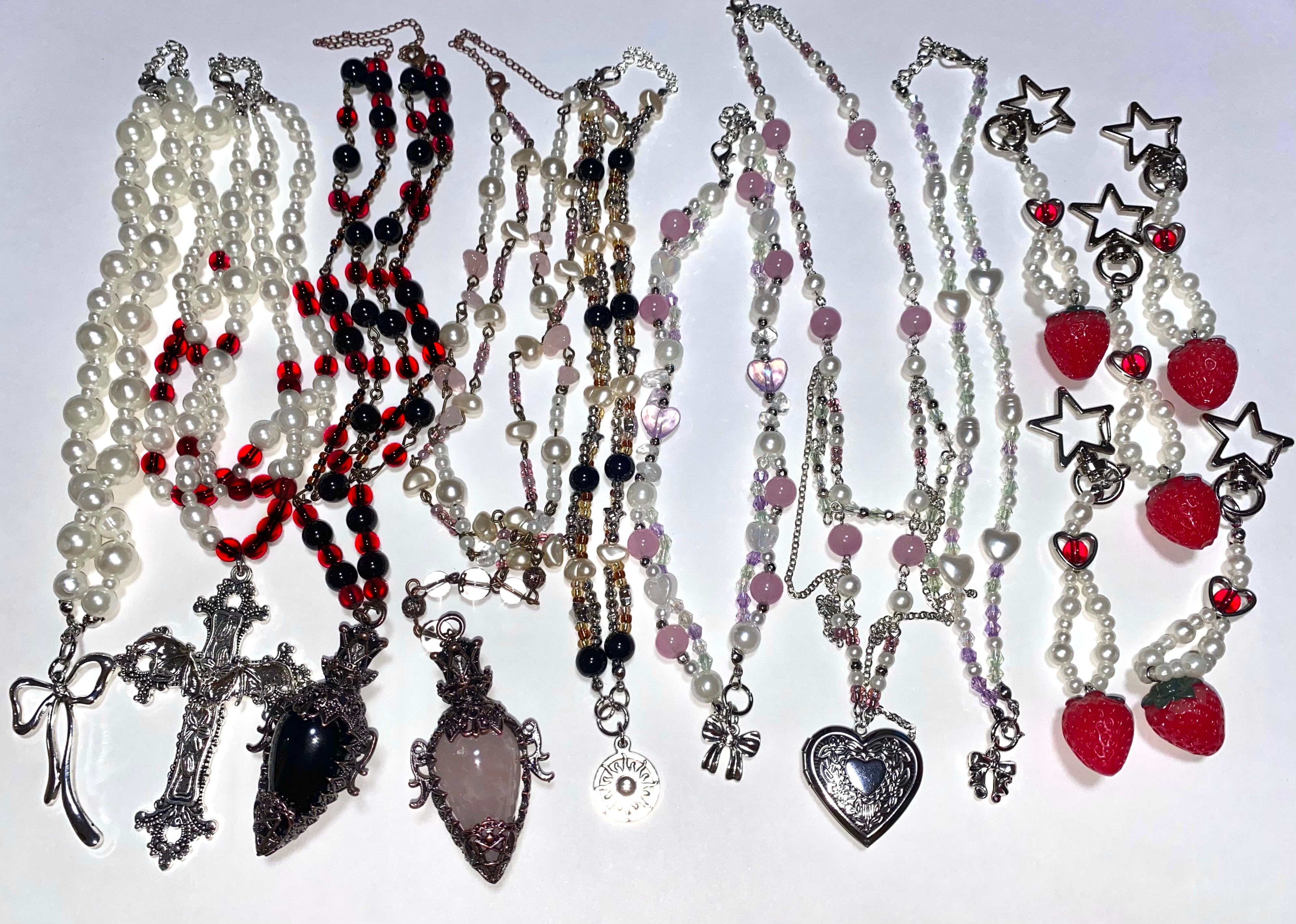 優しい色合いのビーズと大きなリボンが可愛らしいネックレスです。